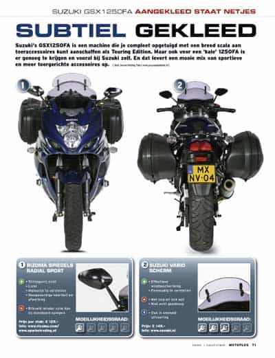Beide hebben een versnellingsindicator, verwarmde handvatten en, net als de BMW, een in hoogte verstelbare ruit.Alleen bij de FJR kun je de stuurhelften in drie standen verstellen. Maar daar moet je wel voor naar de dealer. Tractiecontrole (uitschakelbaar) bieden alleen de BMW en de Kawasaki. Een bandendrukmeter zit standaard op de GTR, bij de RT krijg je hem tegen meerprijs. De oliepeilstokken zijn bij de Honda, de Harley en de Triumph nogal omslachtig in gebruik. Bij de Honda moet je bijvoorbeeld eerst een plastic kapje aan de rechterkant van de motor verwijderen. Afgezien van de kofferset, de versnellingsindicator en het in hoogte verstelbaar zadel is de Suzuki verder wat karig uitgerust. Wat er bijvoorbeeld ontbreekt is een startonderbreker, zoals de Triumph die wel heeft. Maar die heeft op zijn beurt dan weer geen waarschuwingslampjes en verstelbare ruit, die op de GSX1250FA in bescheiden formaat wel aanwezig zijn.[Kasten Windschutz – Seite 23]WINDBESCHERMINGDe grote, elektrisch verstelbare ruit van de RT heeft een stelbereik van 14 centimeter. Ook de FJR en de GTR doen het elektrisch en wel met een bereik van 12 centimeter.