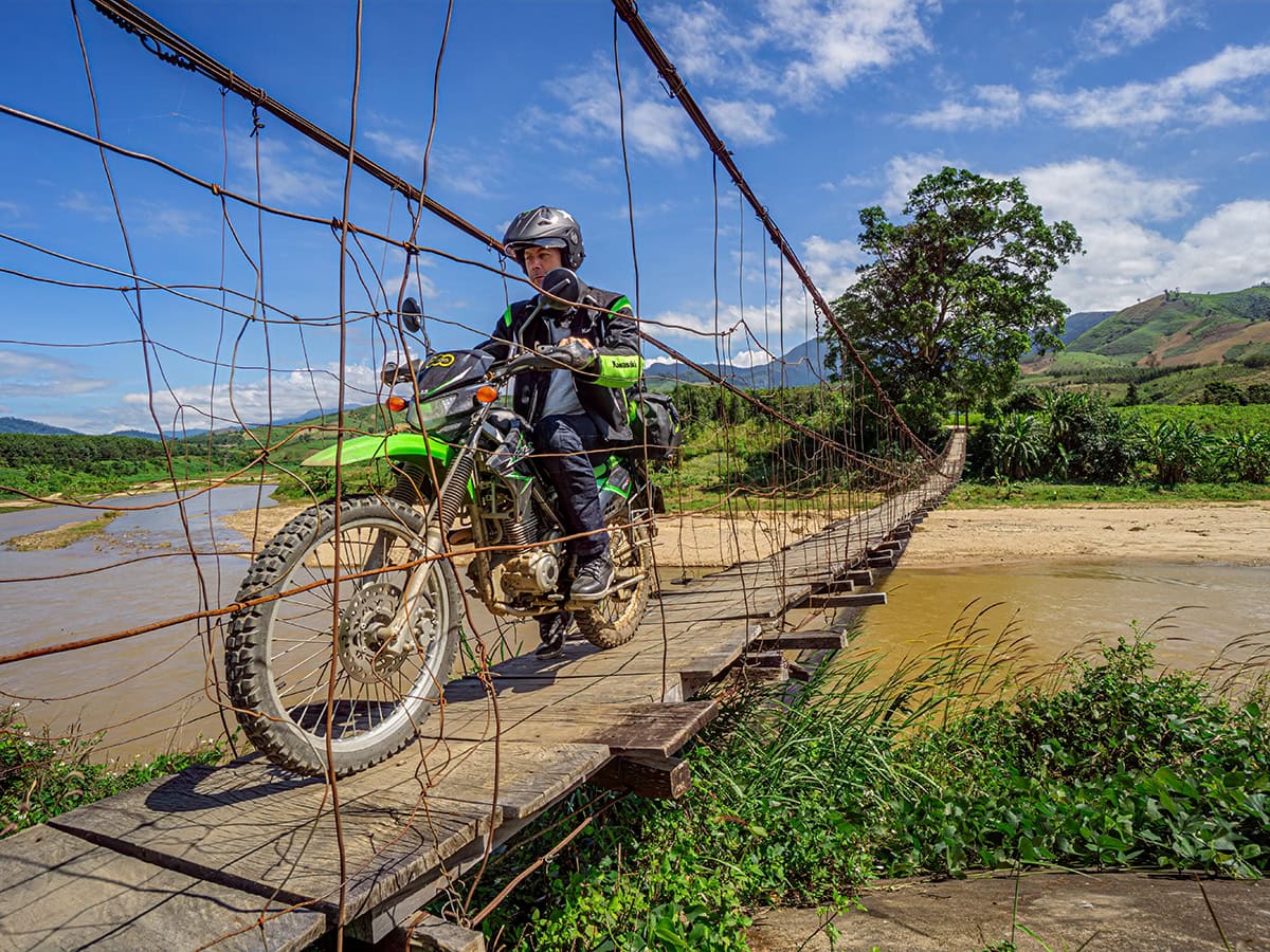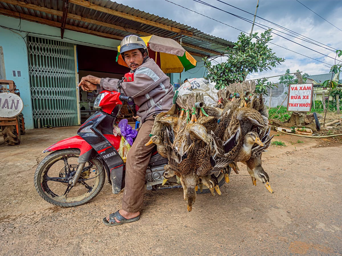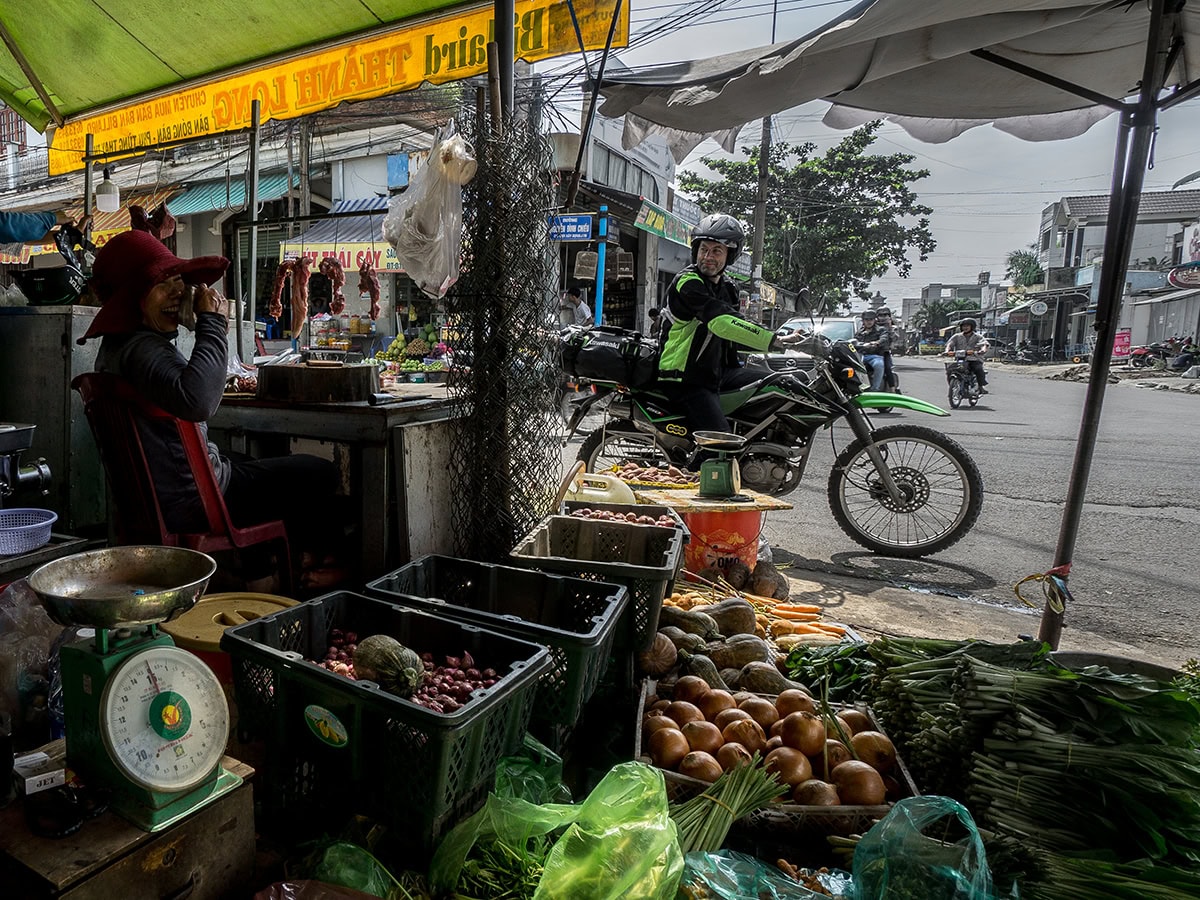De GPS geeft iets minder dan 200 kilometer aan naar Da Lat en een blik op de kaart stemt mij veelbelovend. De volgende paar kilometer zijn erg bochtig, maar direct de eerste klim van de dag al zorgt ervoor dat de Kawa’s hun 12,5 pk’s werkelijk tot op de laatste druppel moeten uitwringen. Derde versnelling, volgas en optimaal gebruik makend van het momentum helpt je dan vervolgens een beetje frivool de volgende klim over. Maar het inhalen van andere weggebruikers vereist niet alleen gevoel voor natuurkunde, maar ook moed. Geen ruimte voor angst. Mijn motorfiets is meestal redelijk goed op dreef. De remmen werken, de uitlaat rammelt niet en de banden hebben nog redelijk wat profiel, iets dat ik niet kan zeggen van het gros van de andere voertuigen op de weg. Wat op menig scootertje wordt meegesjouwd, zou voor een flinke bestelbusje in Europa al een hele uitdaging zijn.
