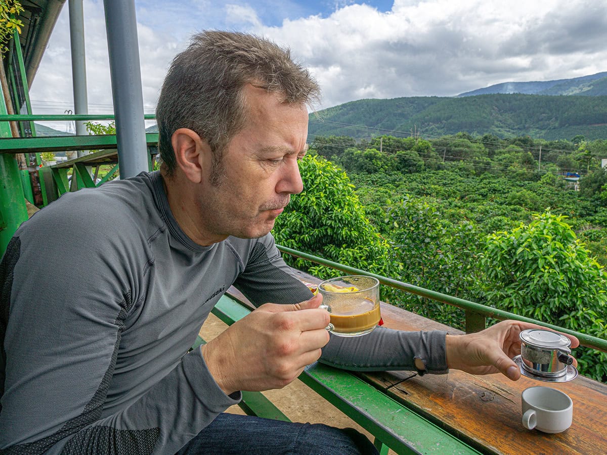 In de bergen rond Da Lat wordt wezelkoffie of kopi luwak geproduceerd. Alleen als koffiebessen door het darmkanaal van een civetkat is gegaan, ontstaat de speciale smaak van deze koffie. Dit type verfijningsproces maakt het de duurste koffie ter wereld, de bonen zijn net zo kostbaar als parfum. Martin proeft de bonen en beschrijft dat de koffie een zeer sterke en hartige smaak heeft. Als zelfverklaarde theedrinker, blijf ik liever weg van dit digestieve product, al is het alleen al om de productiemethode die we hier van dichtbij kunnen meemaken. Om aan de wereldwijde vraag naar deze hyperexclusieve koffie te voldoen, worden duizenden dieren in kleine kooien gehouden, waar ze niets anders te eten krijgen dan deze koffiebonen.
