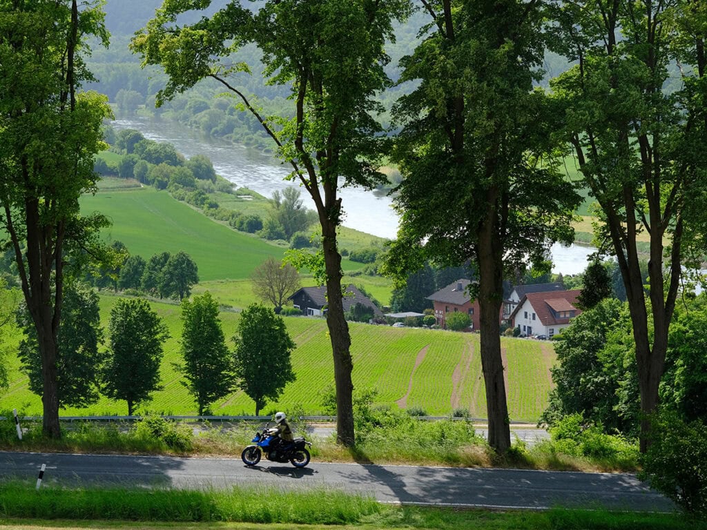 De naam zegt het al: in het Weserbergland draait alles om bochten en de gelijknamige rivier. Maar tijdens deze rit blijft het niet bij alleen mooie stuurwegen langs de Weser, we trekken ook oostwaarts en pakken een stukje van het dichtbeboste Solling-Vogler mee, waarbij onderweg verrassend veel cultuur de revue passeert, van mobiliteitsgeschiedenis tot porselein en een portie sterke verhalen.