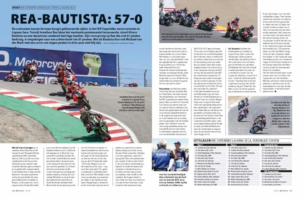 De contrasten tussen de twee hoogst geklasseerde rijders in het WK Superbike waren extreem in Laguna Seca. Terwijl Jonathan Rea bijna het maximale puntenaantal incasseerde, stond Alvaro Bautista na een desastreus weekend met lege handen. Zijn voorsprong op Rea die ooit 61 punten bedroeg, is omgebogen naar een achterstand van 81 punten. Net als Bautista kon ook Michael van der Mark met een score van negen punten in drie races niet blij zijn.