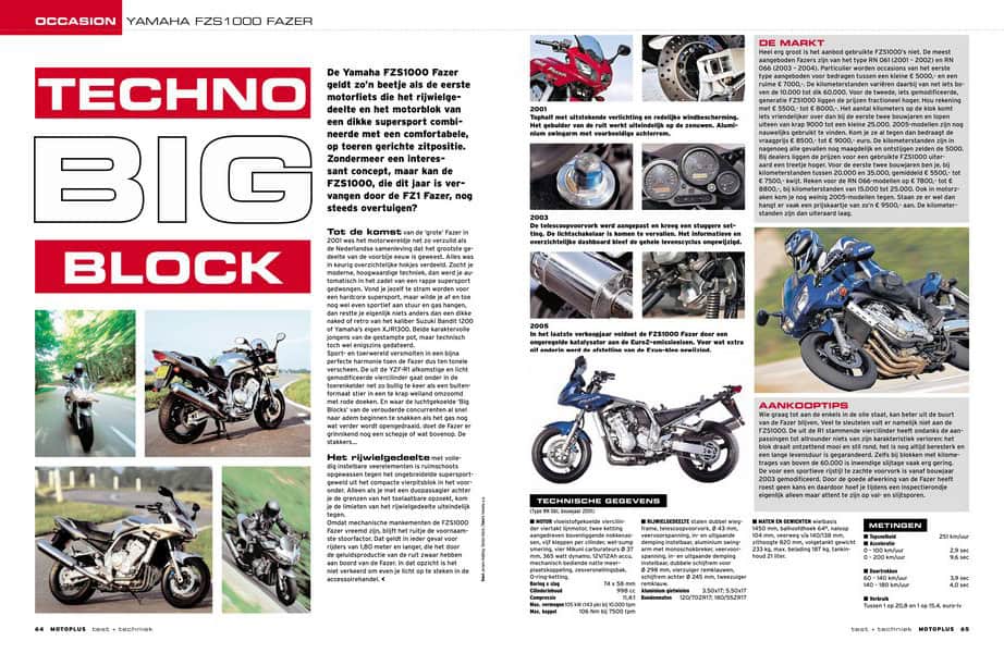 Alleen als je met een duopassagier achter je de grenzen van het toelaatbare opzoekt, kom je de limieten van het rijwielgedeelte uiteindelijk tegen. Omdat mechanische mankementen de FZS1000 Fazer vreemd zijn, blijft het ruitje de voornaamste stoorfactor. Dat geldt in ieder geval voor rijders van 1,80 meter en langer, die het door de geluidsproductie van de ruit zwaar hebben aan boord van de Fazer. In dat opzicht is het niet verkeerd om even je licht op te steken in de accessoirehandel. AANKOOPTIPS Wie graag tot aan de enkels in de olie staat, kan beter uit de buurt van de Fazer blijven. Veel te sleutelen valt er niet namelijk niet aan de FZS1000. De uit de R1 stammende viercilinder heeft ondanks de aanpassingen tot allrounder niets van zijn karakteristiek verloren: het blok draait ontzettend mooi en stil rond, het is nog altijd beresterk en een lange levensduur is gegarandeerd. Zelfs bij blokken met kilometrages van boven de 60.000 is inwendige slijtage vaak erg gering. De voor een sportieve rijstijl te zachte voorvork is vanaf bouwjaar 2003 gemodificeerd. Door de goede afwerking van de Fazer heeft roest geen kans en daardoor hoef je tijdens een inspectierondje eigenlijk alleen maar attent te zijn op val- en slijtsporen.