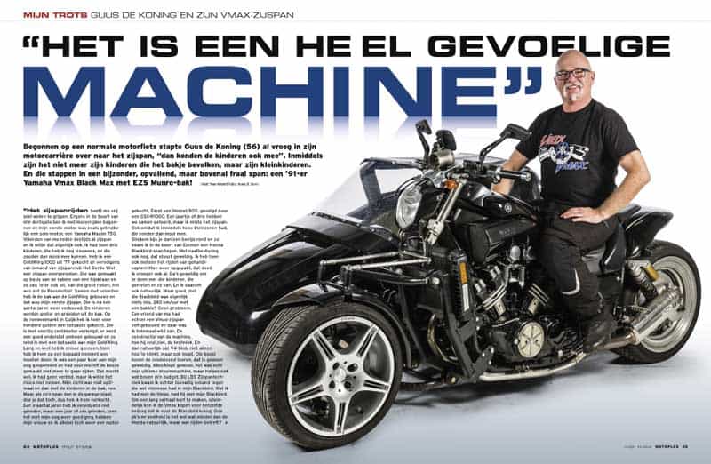 Begonnen op een normale motorfiets stapte Guus de Koning (56) al vroeg in zijn motorcarrière over naar het zijspan, “dan konden de kinderen ook mee”. Inmiddels zijn het niet meer zijn kinderen die het bakje bevolken, maar zijn kleinkinderen. En die stappen in een bijzonder, opvallend, maar bovenal fraai span: een 91’er Yamaha Vmax Black Max met EZS Munro bak!