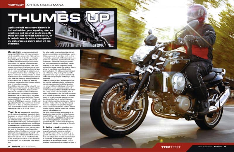 In de tweede helft van 2007 komt Aprilia met de elegante NA850 Mana. Een bijzondere en doordachte verschijning, met vooral onderhuids opvallende techniek. zo heeft deze 75 pk sterke vloeistofgekoelde 850cc 90° V-twin een semi-automatische versnellingsbak met zeven versnellingsratio’s aan boord. In het zadel van de ketting aangedreven Mana heb je de keuze uit automatisch of sequentieel schakelen. In het eerste geval zorgt de CVT-transmissie er voor dat je continu de beschikking hebt over het maximale koppel van 76,5 Nm. Je hebt daarbij keuze uit drie mappings: sport, toer en regen. Tijdens het rijden kun je van setting wisselen en kun je ook switchen naar sequentieel schakelen. Dat kan middels een simpele druk op de twee knoppen op de linker stuurhelft of traditioneel met het schakelpedaal. Het koppelingshendel ontbreekt.
