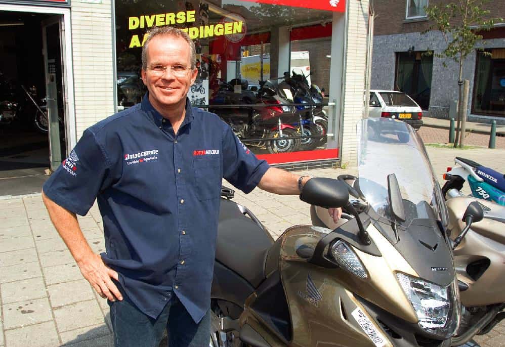 MOTORZAAK IN THE PICTURE MOTOR MERCUUR, DEN HAAG Tachtig jaar geleden begon het allemaal in een pandje in het centrum van Den Haag, toen nog een reparatie zaakje, nu een all-round motorpaleis van 1400 vierkante meter. Het accent heeft echter niet altijd op motoren gelegen, want in de jaren ’50 en ’60 werden er ook tijdelijk auto’s verkocht. Volgens directeur Tom Homs (52) was dat indertijd een logische keuze. “In die jaren was er onder de consument vooral behoefte aan auto’s en bromfietsen en daar spring je als ondernemer natuurlijk op in. Wij verkochten daarom indertijd ook Honda en Fiat automobielen, de motorfiets heeft echter in zijn hele hoedanigheid altijd centraal gestaan bij ons,”aldus Homs. Dat de speciale band met Honda altijd is gebleven, blijkt wel uit het feit dat Motor Mercuur exclusief dealer van het Japanse merk is voor Den Haag en omstreken. Daarnaast is er ook een grote rol weggelegd voor Ducati, waarbij er in de zaak aan de Pletterijkade een apart gedeelte is ingericht als Ducati-store. Het shop-in-shop concept is één van de typische kenmerken van de Haagse onderneming, en is in het leven geroepen om het voor de klant allemaal zo overzichtelijk mogelijk te maken. Er is zelfs een ruimte die zich helemaal richt op de verkoop van motorscooters, van de lichte 125 cc’s tot de zware 600 versies. Over de toekomst is Homs lichtelijk positief:”Het is een moeilijk jaar, maar de consument heeft nu wat meer vertrouwen in de economie. Dat zal ongetwijfeld een positieve invloed op de markt hebben.