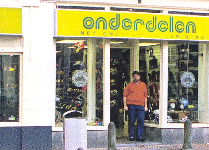 MOTORZAAK IN THE PICTURE ONDERDELEN STRUIK, LEIDEN We schrijven 1929. Tjabring Struik drijft een handelsbedrijf in auto-onderdelen, het merendeel van Ford, die hij verkoopt op de markt in Leiden. Hier is hij wekelijks te vinden, tot hij na de Tweede Wereldoorlog een pand betrekt aan de Groenesteeg 3 in Leiden. Rien Struik eigenaar van Onderdelen Struik: ”We weten niet eens wanneer hij precies is begonnen met de winkel, maar wel dat het pand aan de Groenesteeg 3 al snel te klein werd, waardoor er verhuisd moest worden naar een groter pand iets verderop in dezelfde straat. De zaak is daarna nog twee keer van adres verwisseld, waarvan de laatste keer in 1974. Toen zijn we verhuisd naar de Hooigracht 51-53 en daar zitten we nog steeds.” Het bedrijf is begonnen met de handel in auto-onderdelen, maar tegenwoordig staat alleen de motorfiets nog centraal. “Mijn vader was een fervent motorrijder en heeft van zijn passie zijn beroep gemaakt. Gevolg was dat de auto uiteindelijk heeft moeten wijken voor de motorfiets. In 1968 hebben mijn vrouw en Ik de zaak overgenomen. Dat was net in de tijd dat de brommer in opkomst was en dus werden er toen ook bromfietsonderdelen verkocht. Begin jaren ’80 zijn wij naast onderdelen begonnen met de import en fabricage van eigen motorfiets gerelateerde producten als kleding, helmen en accessoires.