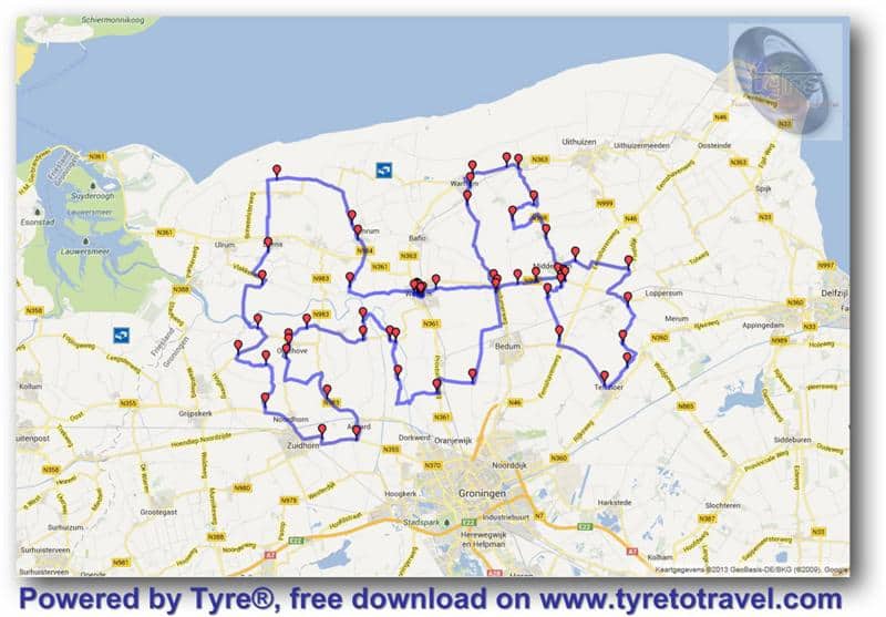 Aduarderzijl en Feerwed zijn de dorpen voor we in Ezinge komen en langs het Museum Wierdenland rijden. Daar is een mooie tentoonstelling met veel informatie over het Groningse Wierenland. Na Saaksum en Oldehove rijden we naar Den Ham en Niehove, beide ook wierdedorpen. Rijdend in noordelijke richting komen we door Leens en dat ligt samen met het oostelijk gelegen Tuinsterwierde op een rij wierden. Via Klein Huisjes komen we in Eenrum, de volgende in de rij wierdedorpen in Groningen. En de wierde Groot Maarslag is de laatste in deze Roadbook-tour, voor we via Schouwerzijl terug zijn in Winsum..