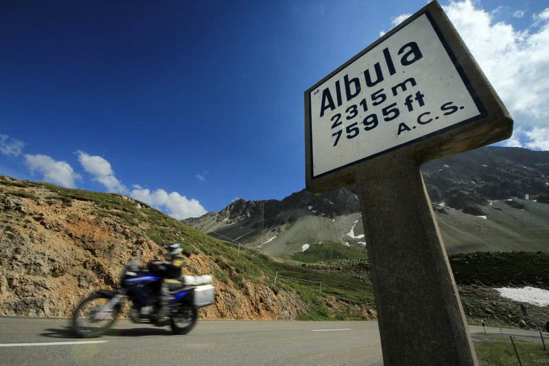 De hoger gelegen bergpassen komen gemakkelijk boven de 2.000 meter, de Gavia bevindt zich zelfs 2.618 meter boven zeeniveau. Het is zeker ook wat betreft de rijvaardigheid de meest veeleisende pas. Extreem nauwe haarspeldbochten goed beheerst te kunnen rijden, bevordert het rijplezier enorm. Veel meer ontspannen gaat het er aan toe op de Bernina-bergpas. Mooi geasfalteerde, overzichtelijke haarspeldbochten zorgen voor een opperbeste stemming in een van de mooiste Alpenlandschappen. Doe het rustig aan bij de spoorwegovergang bij de Morteratsch-gletsjer, als je niet wilt worden gelanceerd. Degene die het lukt om vroeg op te staan in de vakantie wordt beloond met weinig verkeer op de wegen en grandioze panorama’s. En deel dergelijk mooie foto’s vooral met ons, wellicht vind je deze dan terug in MotoPlus, hetgeen je ook nog het enige echte MotoPlus T-shirt oplevert ook!