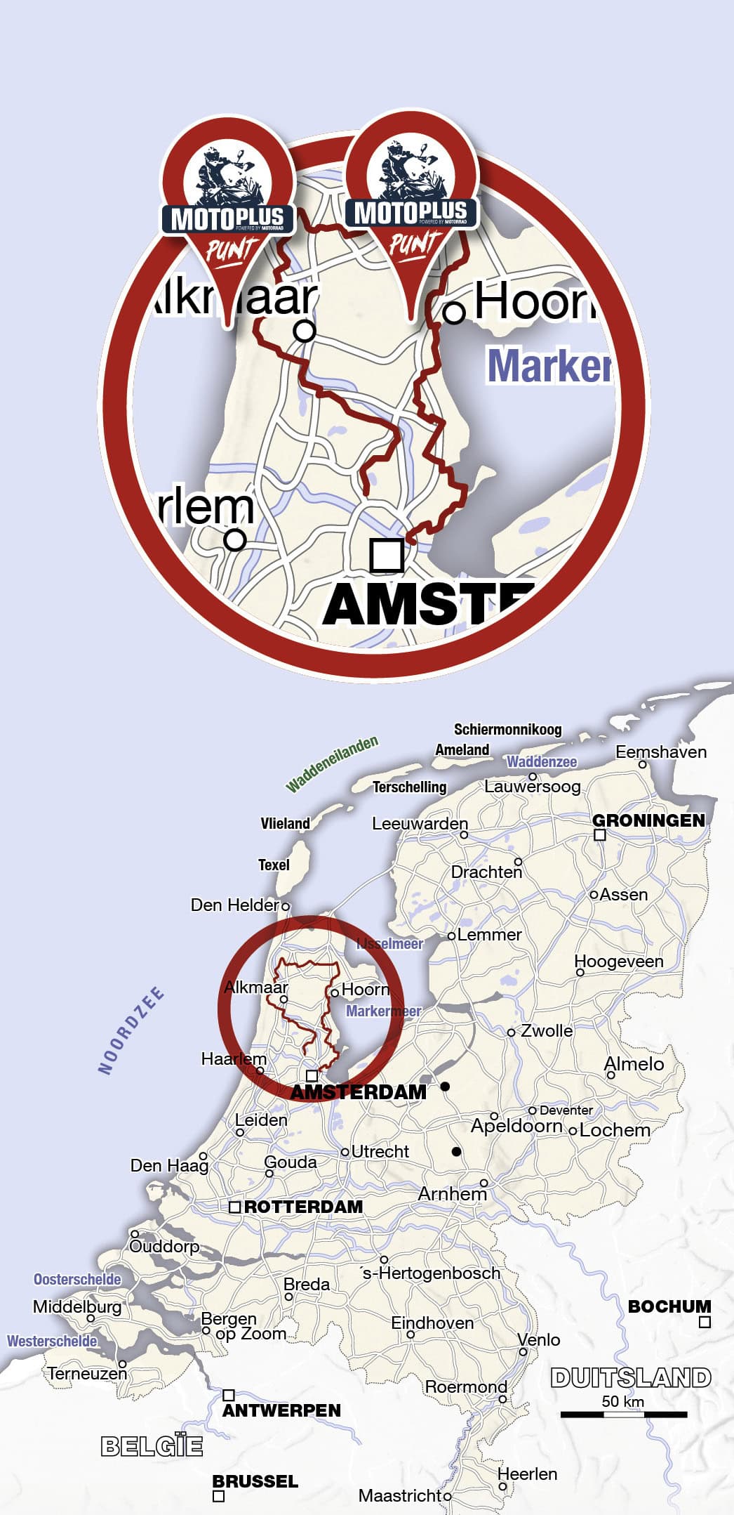 Het eerste MotoPlusPunt is in Schoorl. Vanaf het zonnige terras van Het Trefpunt heb je uitzicht op het klimduin. Je kunt er genieten van een uitgebreide lunchkaart en de vele passerende motorrijders. Na Schoorl steken we dwars door de provincie Noord-Holland en is het even lekker door rijden naar Medemblik. Daar kruisen we de spoorlijn van de stoomtrein tussen Hoorn en Medemblik. In Wognum kom je bij het klassieke café De Stam, het tweede MotoPlusPunt. Na Hoorn kom je door het dorpje Etersheim dat is uitgeroepen tot het Land van Dik Trom. Hoewel de schavuit hier nooit heeft gewoond, zijn de polder, vaarten, slootjes en de molen wel precies de omgeving waar Dik opgroeide en die is beschreven in de kinderboeken van C. Joh. Kieivit.