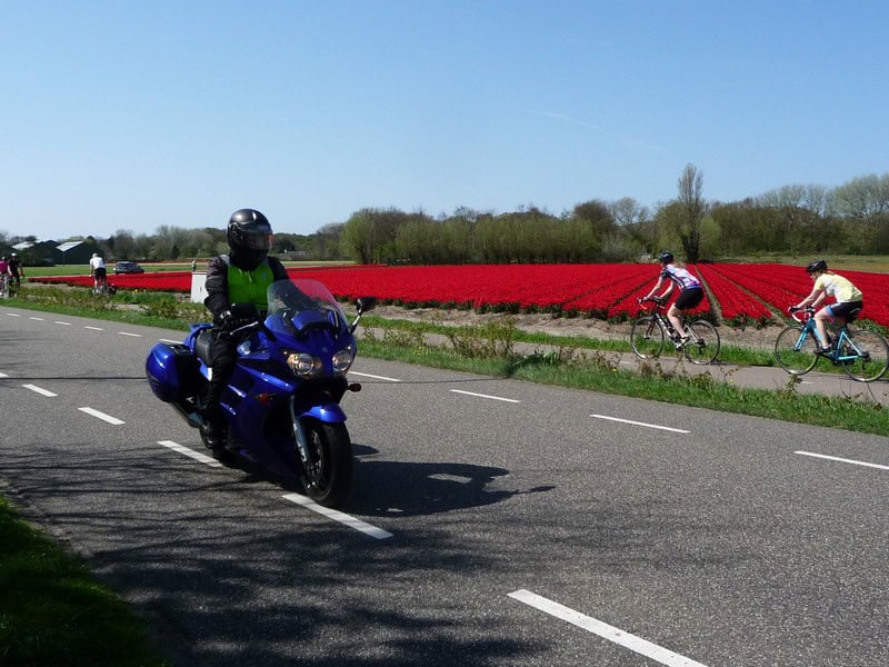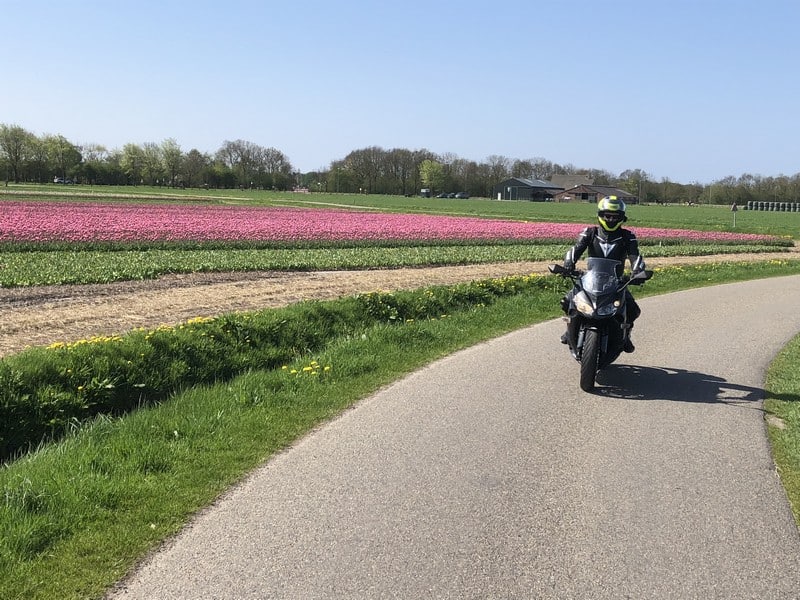 Het eerste deel voert je door de oudste droogmakerijen van Nederland, al in de 17e eeuw zijn de Schermer en de Beemster droog gepompt met windmolens. Het landschap kenmerkt zich door statige, vaak monumentale stolpboerderijen, met de typische piramidevormige daken, met stevige erfbeplanting eromheen. Regelmatig rij je over smalle dijkjes met aan beide zijden een wijds uitzicht over het oude landschap. Na zo’n vijftig kilometer komen de duinen van Egmond en Bergen in zicht en in het voorjaar kun je genieten van de kleurenpracht van de bollenvelden. Het leuke van motorrijden is dat je ook je omgeving kunt ruiken. Vooral de hyacinten verspreiden een indringende geur die je helm binnen dringt als de bloemen volop in bloei staan.
