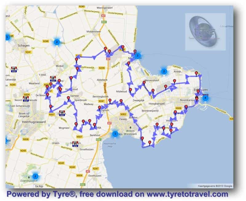 De laatste MotoPlus Roadbook-tour van 2013 voert ons rond Enkhuizen. Niet via de veelbereden IJsselmeerdijk, maar na een paar stukjes dijk gaan we het achterland van Enkhuizen, oftewel West-Friesland, verkennen. Vanaf Enkhuizen rijden we over de Zuiderdijk naar Oostergouw en door Venhuizen naar Oosterleek. Vanaf Oosterleek rijden we over, de Westfriese Omringdijk, naar Schellinkhout en verlaten daar de dijk langs het IJsselmeer. Door het Drechterland, ten noordoosten van Hoorn – een echt fruitteelt gebied – komen in Nibbixwoud. Via de Bobeldijk komen we in het Wester-Koggenland en in Spierdijk.