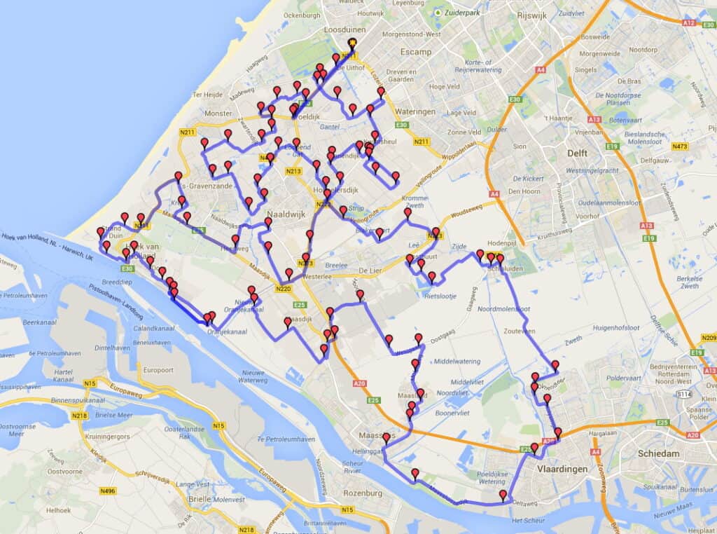 Na Hoek van Holland rijden we richting ‘s Gravenzande en Naaldwijk, bij De Lier komen we langs de tweede veiling in deze route, The Greenery. Terug bij Naaldwijk rijden we dan via het veilingcomplex van Flora Holland naar ’s Gravenzande. Via Poeldijk rijden we over prachtig slingerende wegen tussen de kassen door naar de N211 en over die weg rijden we tenslotte weer terug naar Den Haag..