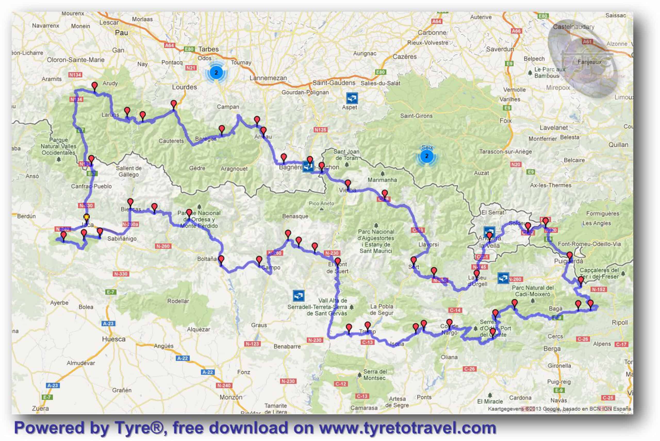 De toerroute van de maand juni komt van Lucio Gallastegui en betreft een rondrit langs de meest belangrijkste bergpassen in de Pyreneeën, zowel de Spaanse, de Franse en Andorra. Start en finish zijn in Jaca (Huesca, Spanje) en vandaaruit is het 1.000+ km genieten van puur natuur, adembenemende uitzichten en haarspeldbochten… De route is geschikt om te splitsen in meerdere dagen en gaat over 28 van de belangrijkste bergpassen in de Pyreneeën (zie de namen van de routepunten) en 16 van de mooiste stadjes in dit berggebied. Hier zijn zeker leuke plekken voor een overnachting te vinden.