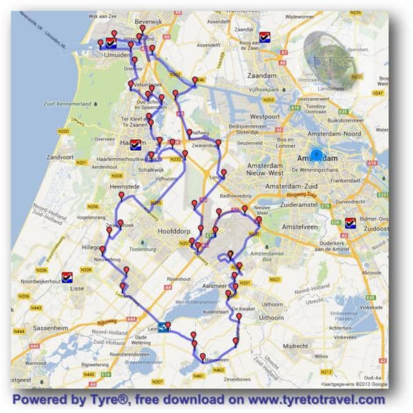Van luchthaven naar zeehaven, dat is de titel van deze toer rondom Schiphol. Want we beginnen onder de rook van luchthaven Schiphol en de rit voert naar de zeehaven en de sluizen bij IJmuiden. De 138 km lange rit start bij Honda Nederland aan de Capronilaan in Schiphol-Rijk en gaat onder de opstijgende en landende vliegtuigen door via Lijnden richting Zwanenburg en dan door de Houtrakpolder en langs het Noordzeekanaal naar Velsen-Noord. Langs de ENCI en Tata Steel (de voormalige Hoogovens) rijden we over de sluisdeuren van het Buitenspuikanaal, de Noordersluis en de Zuidersluis. Met een beetje geluk ligt er op dat moment net een zeeschip in de sluis, een zeer imposant gezicht. Verder gaat het dan door IJmuiden naar Driehuis, vanwaar we langs het Nationaal Park Zuid Kennemerland richting Bloemendaal gaan. Op deze weg komen we langs de terrastip Hoeve Duin en Kruidberg (www.duinenkruidberg.nl) in Santpoort. Even verder op de route zien we de ruïne van kasteel Brederoode.